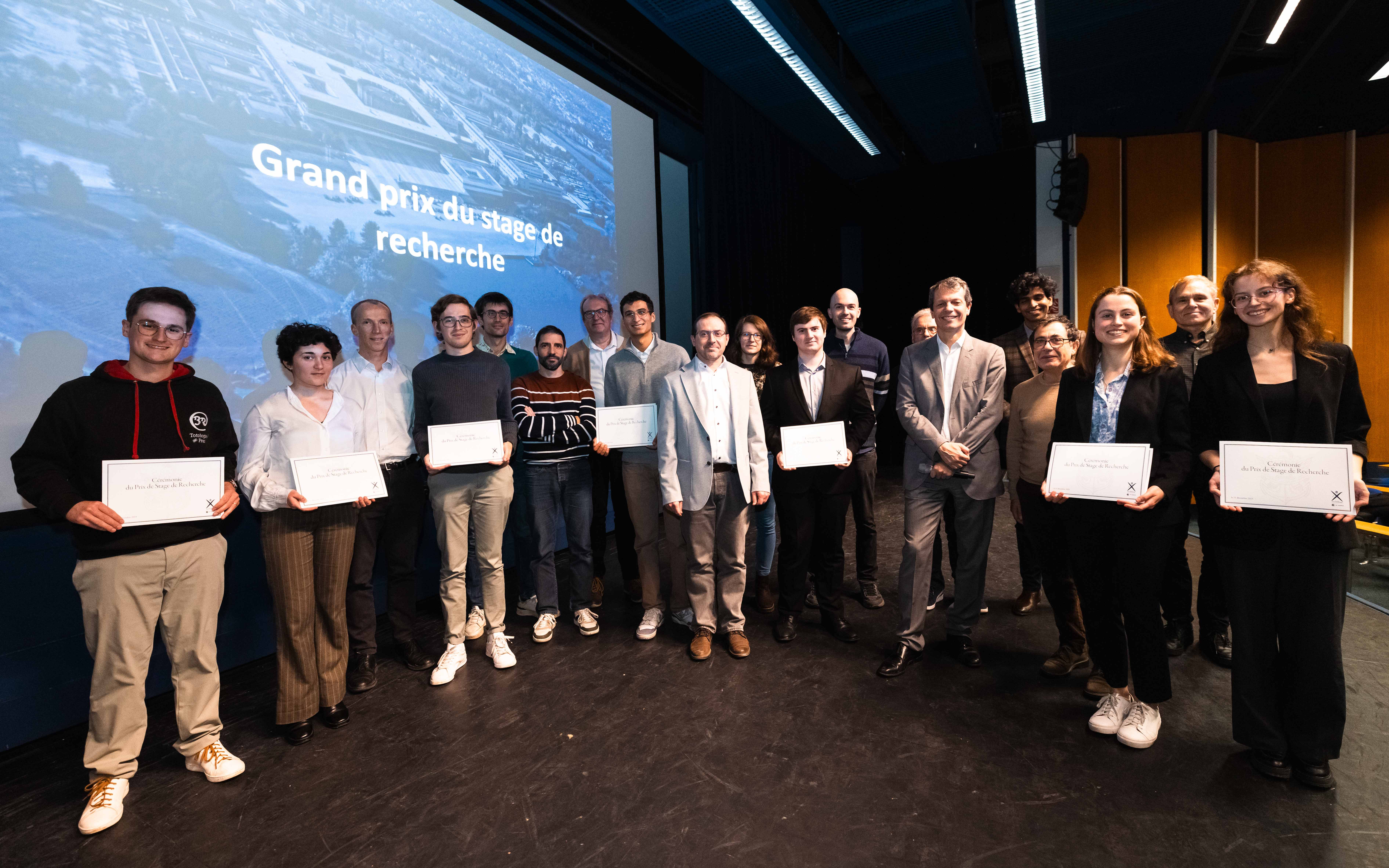 Neuf Grands Prix de stage de recherche ont été remis en biologie (Marie Girault, X2022), chimie (Bérénice Baltzinger, X2022), économie (Aditya Srivastava, Master 1 IP Paris), humanités & sciences sociales (Juliette Beaucousin, X2022), informatique (Thomas Sauvage, X2022), mathématiques (Antoine Merceron, X2022) , mathématiques appliquées (Arthur Compoint, X2022), mécanique (Maël Antunes, X2022) et physique (Robin Ostertag, X2022).