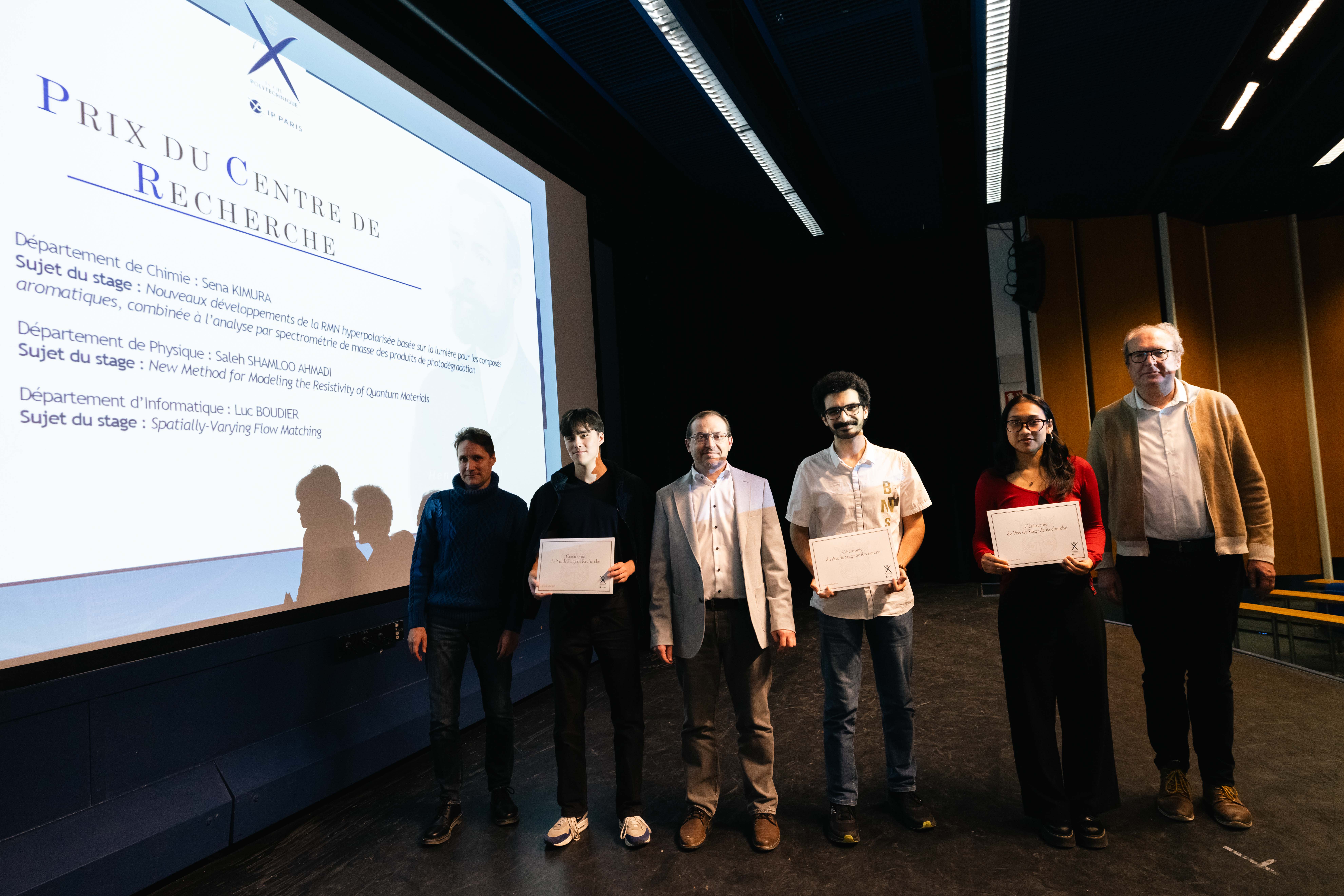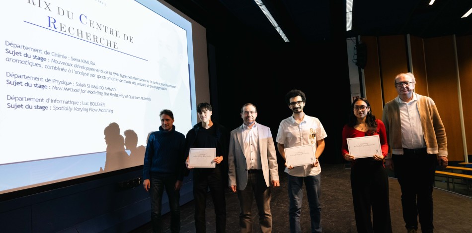 Trois Prix du centre de recherche ont été attribués aux meilleurs stages effectués au sein des 23 laboratoires de l’École. Ils ont été décernés à deux étudiants de l’X en Master IP Paris : Sena Kimura pour son stage de recherche en chimie moléculaire et Saleh Shamloo Ahmadi pour son stage de recherche en physique. Le troisième prix à été décerné à l’élève ingénieur polytechnicien Luc Boudier pour son stage au sein du Laboratoire d’Informatique de l’École polytechnique (LIX*).